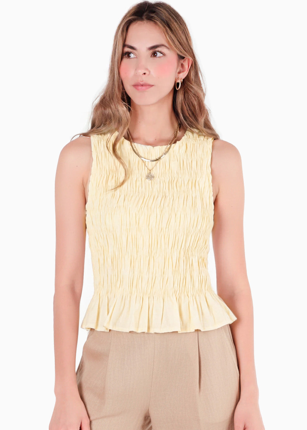- Material: 94% poliéster, 6% elastano.- Blusa color amarillo de tiras en nido de abeja.- Camila, la modelo usa talla S y mide 170 cm.