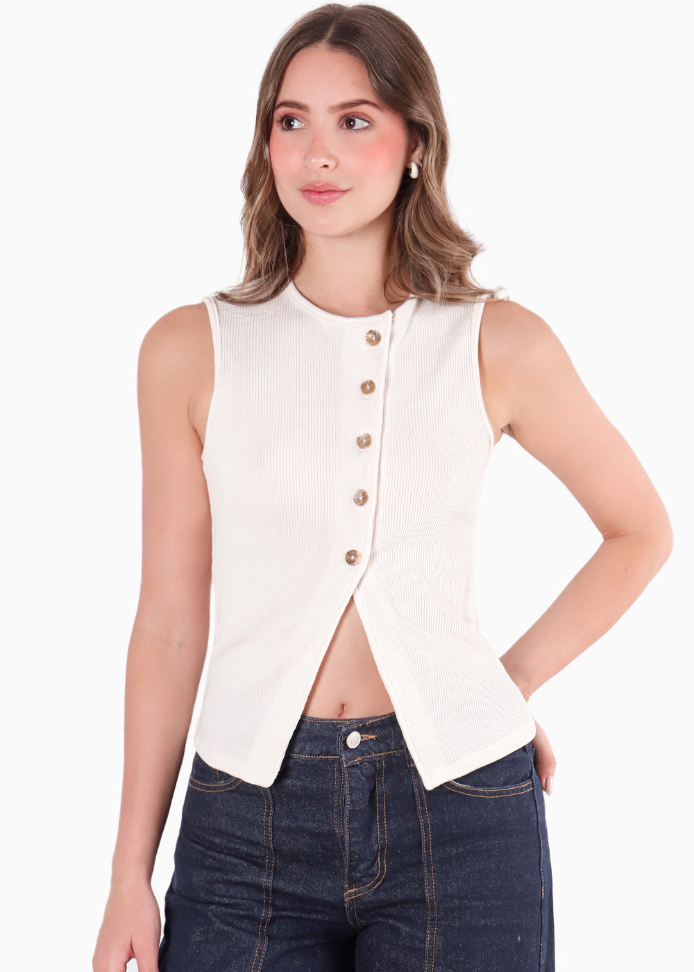 - Chaleco color marfil con perilla cruzada y botones dorados