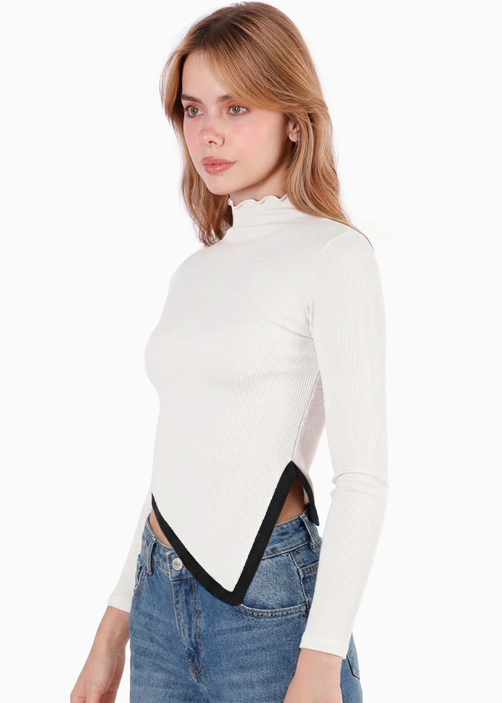 - Blusa color marfil manga larga cuello alto contraste en ruedo.