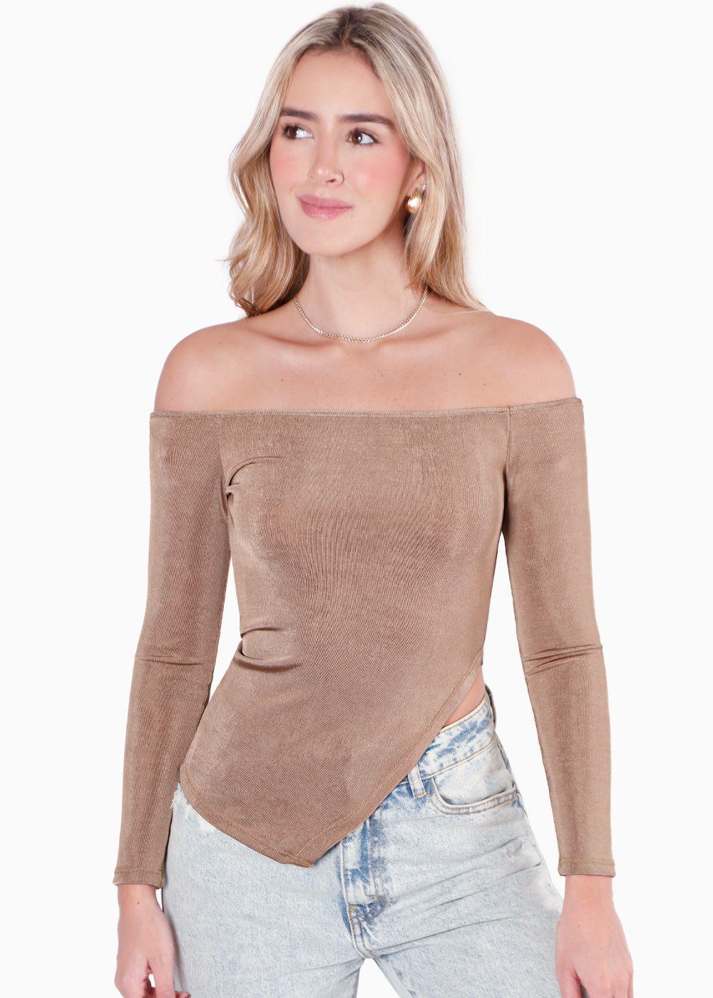 - Blusa manga larga color cafe con escote off shoulder y ruedo asimétrico.