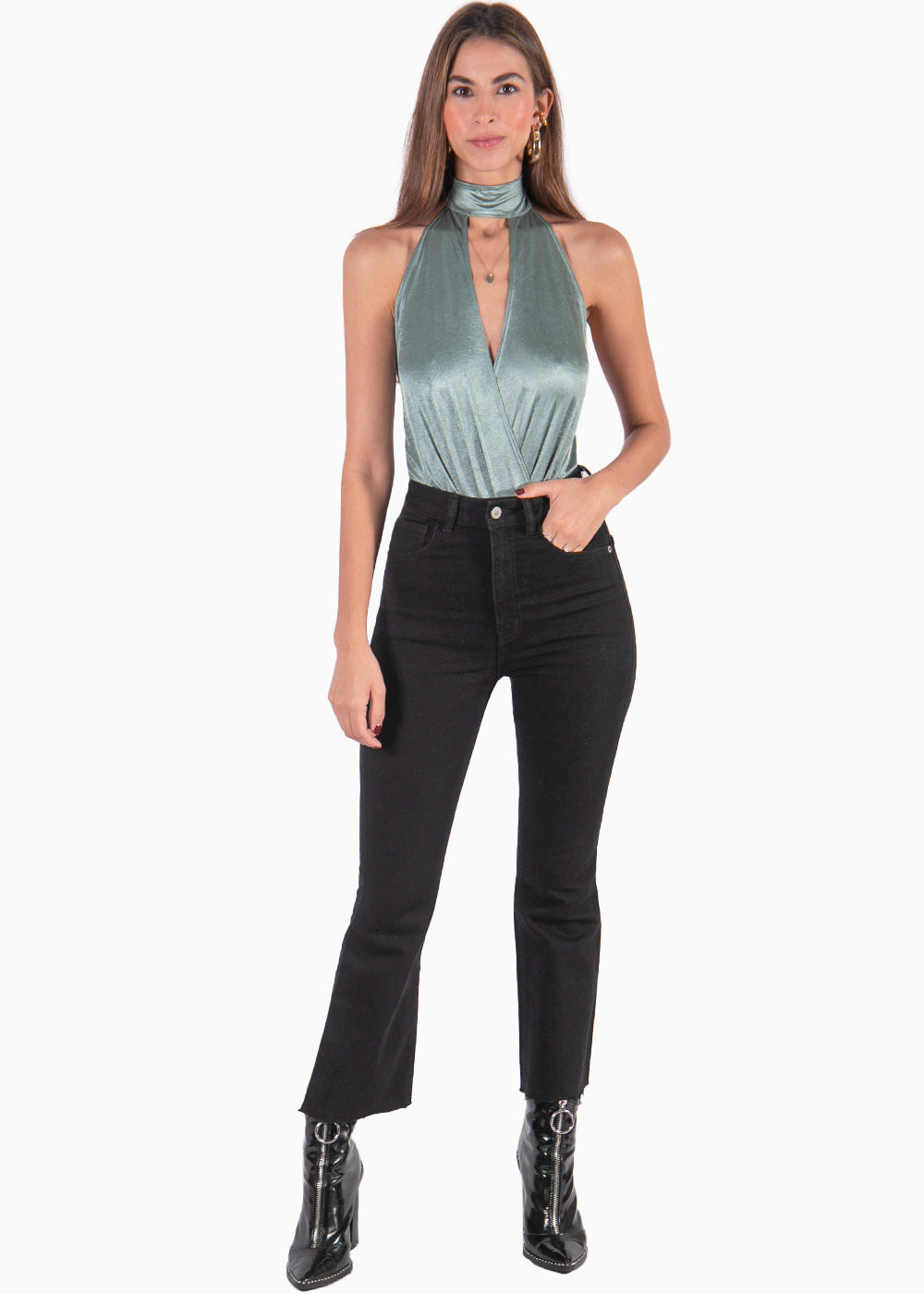 - Material: 93% poliéster, 7% elastano. - Body halter color verde con escote cruzado en v. - El body perfecto para salir de rumba con tus amigas! - Camila, la modelo usa talla XS y mide 170 cm.