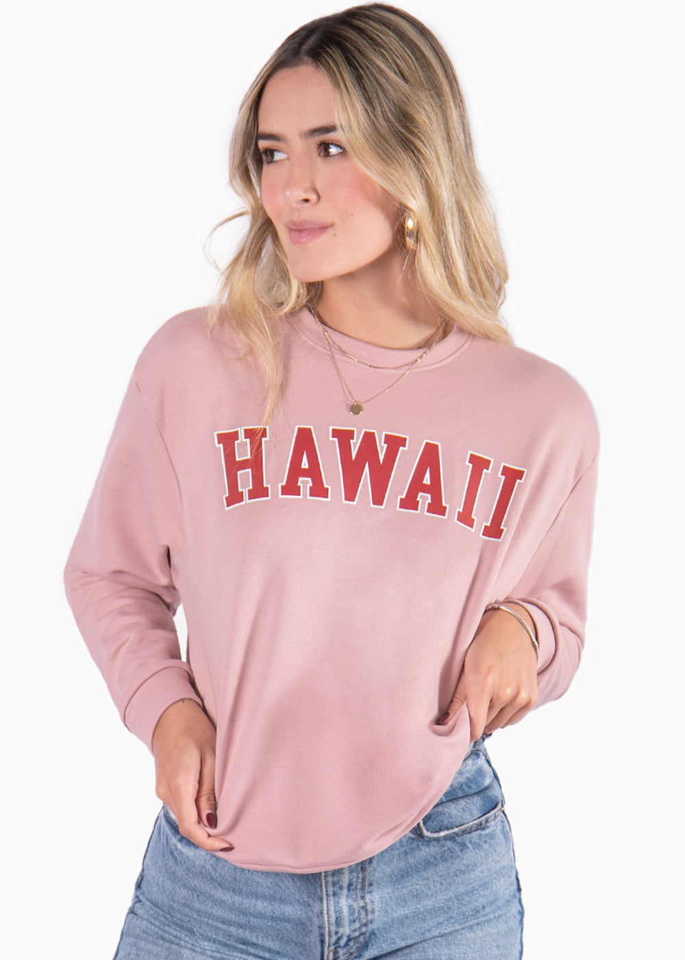 - Buzo color rosado con estampado "Hawaii".