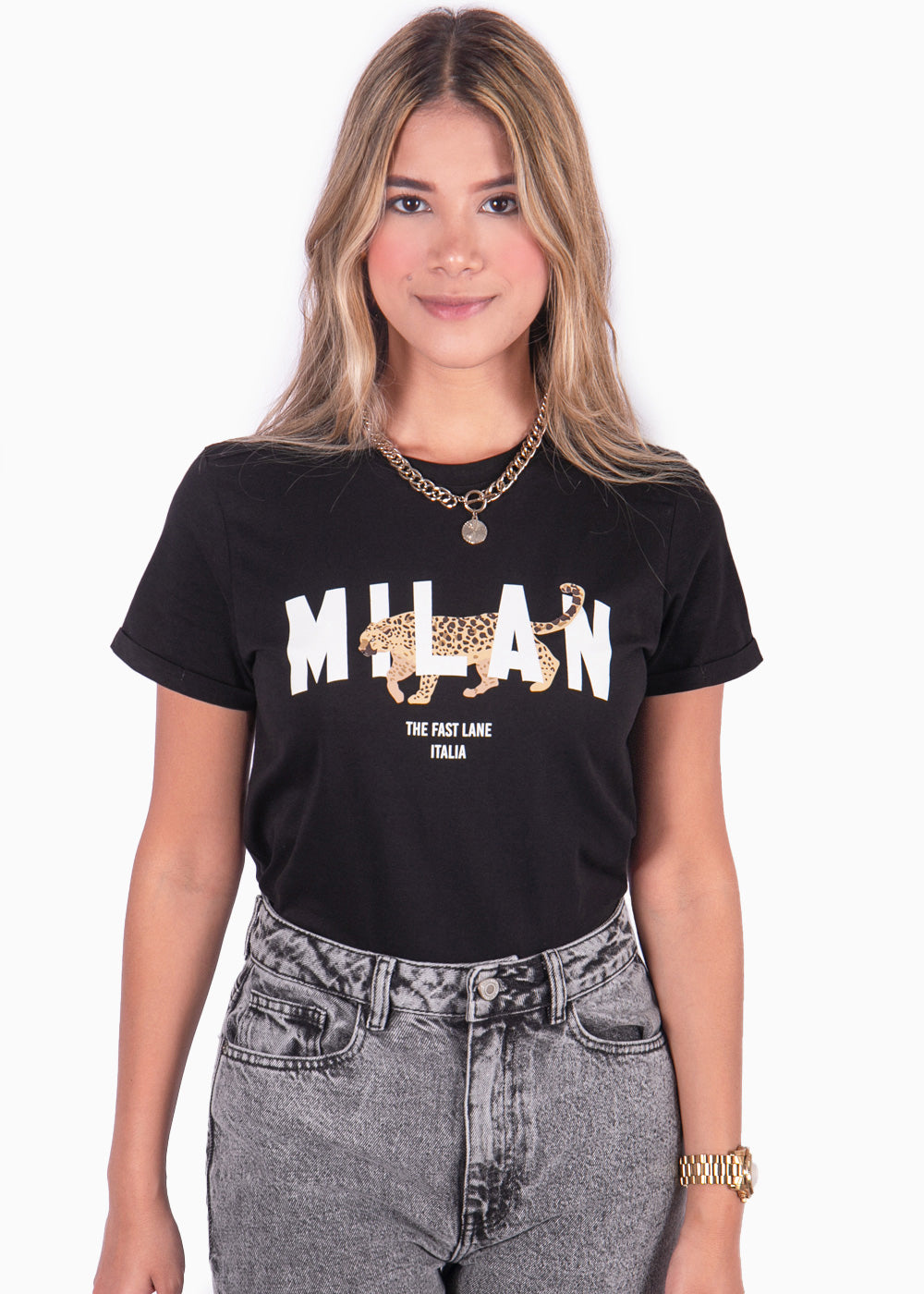 - Camiseta color negro con estampado "Milan" y jaguar , cuello redondo y manga corta.