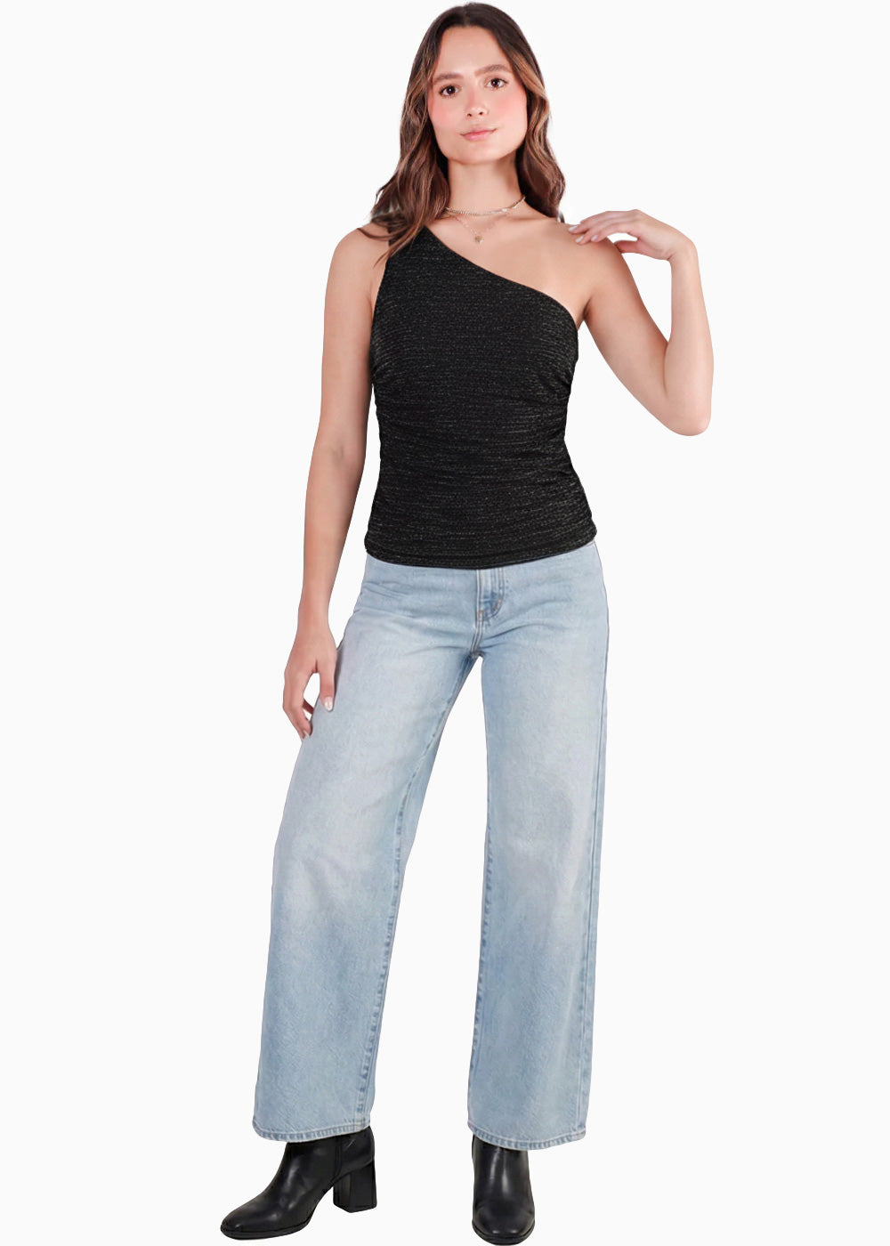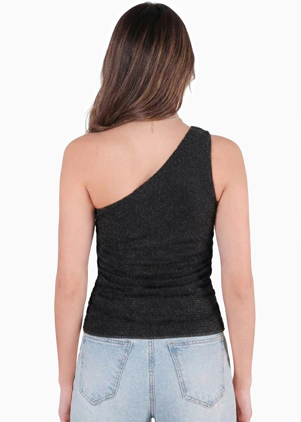 - Blusa color negro drapeada con tira un hombro.