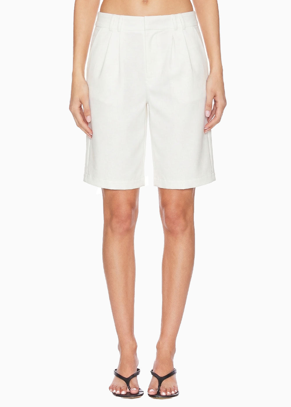 - Material: 97% algodón, 3% elastano.- Bermuda tipo sastre color marfil.- Sofia, la modelo usa talla 6 y mide 172 cm.