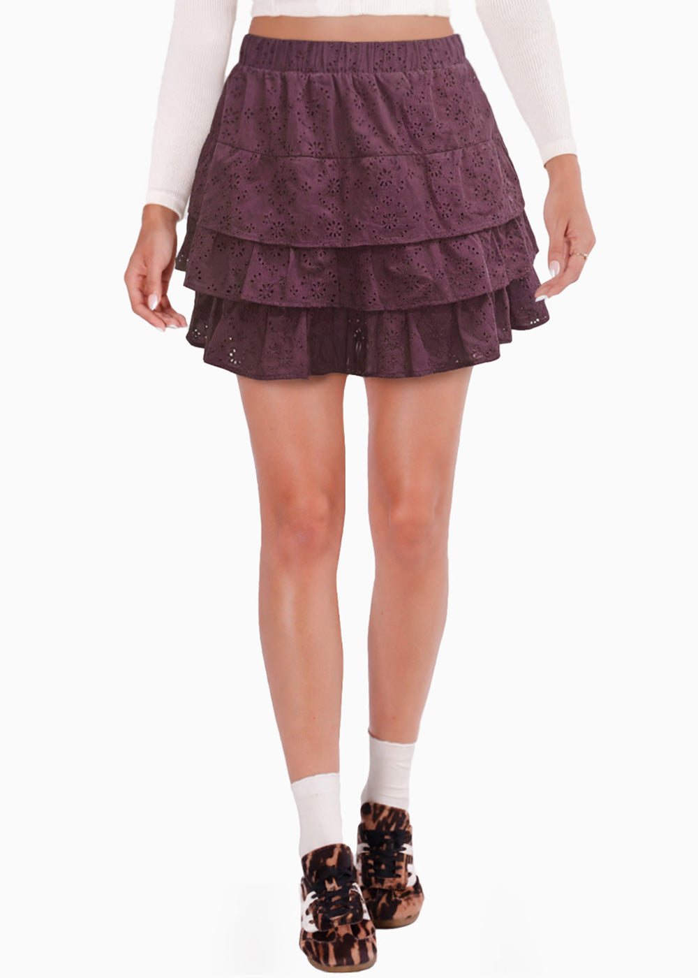 - Falda corta color uva en ojalillo con boleros.