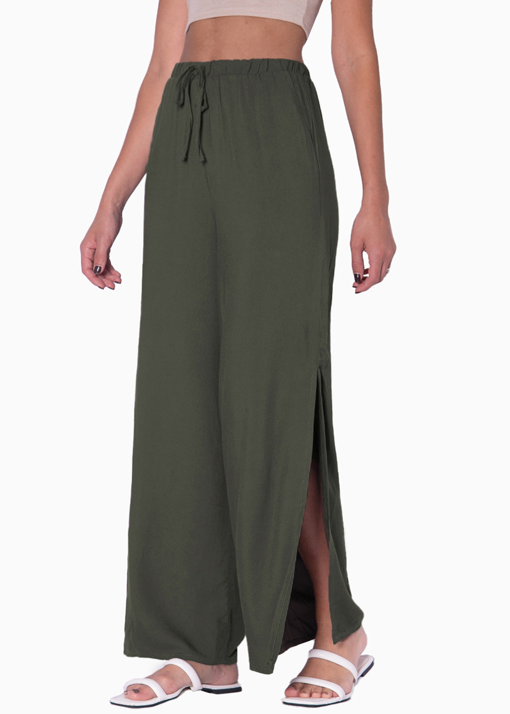 - Pantalón playero color crudo con silueta recta, tiro alto y tela semi traslúcida.