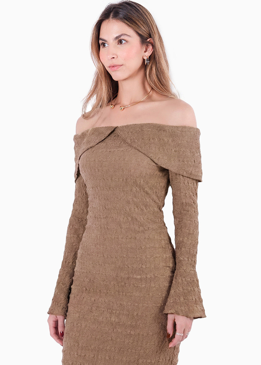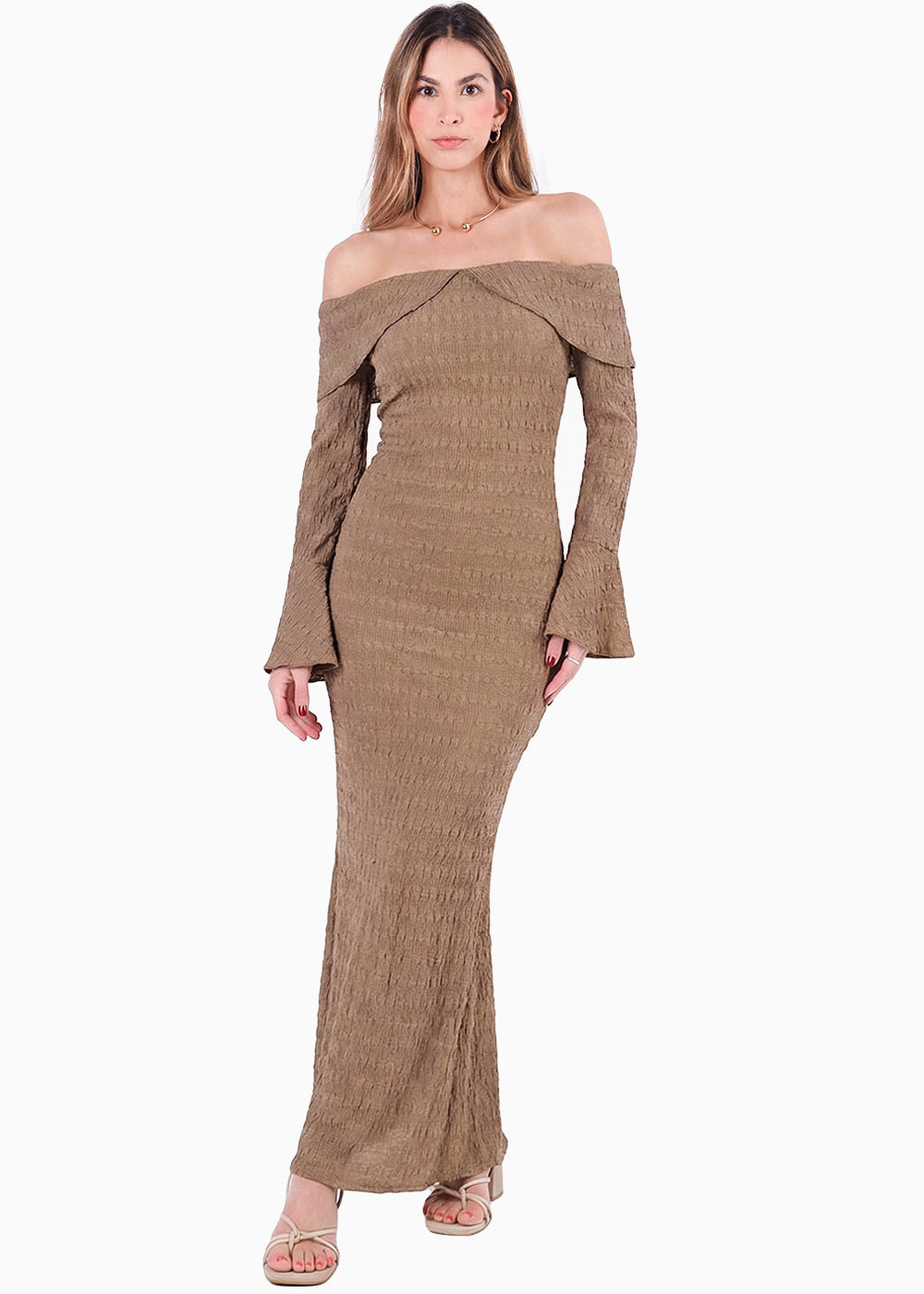 - Vestido largo color café con bolero en mangas y escote bandeja.