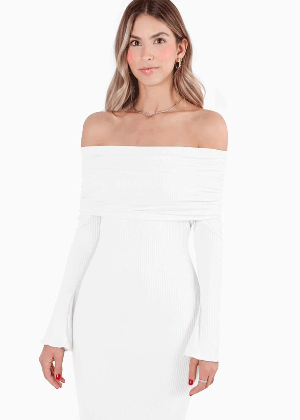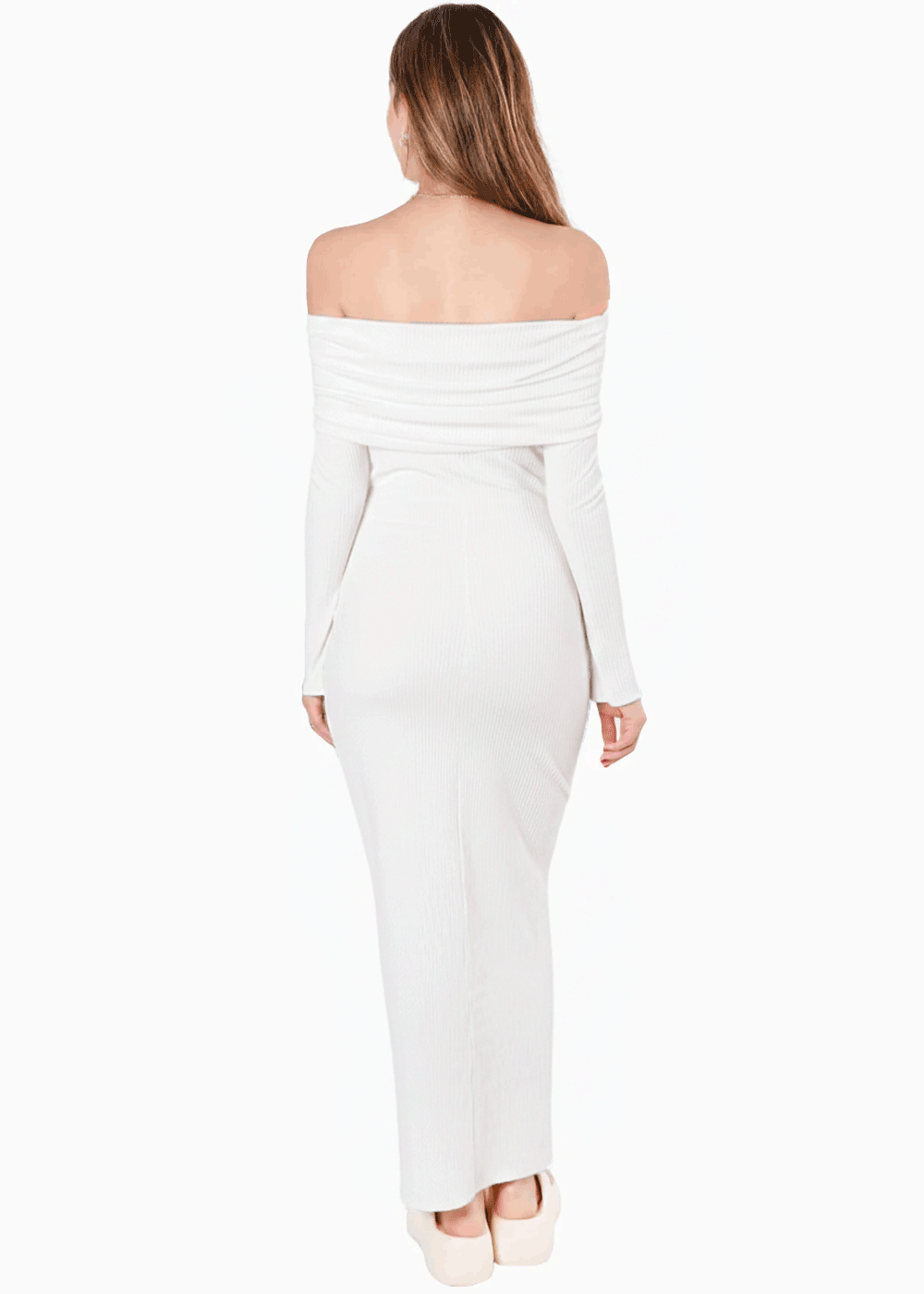 - Material: 95% poliéster, 5% spándex. - Vestido largo color marfil con bolero en mangas y escote bandeja. - Camila, la modelo usa talla XS y mide 170 cm.