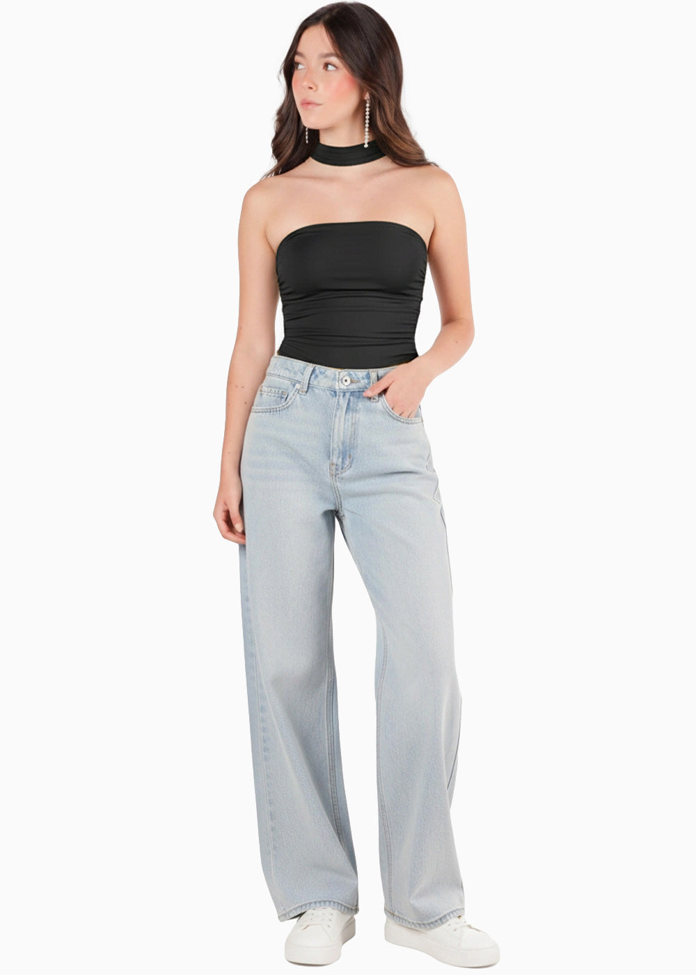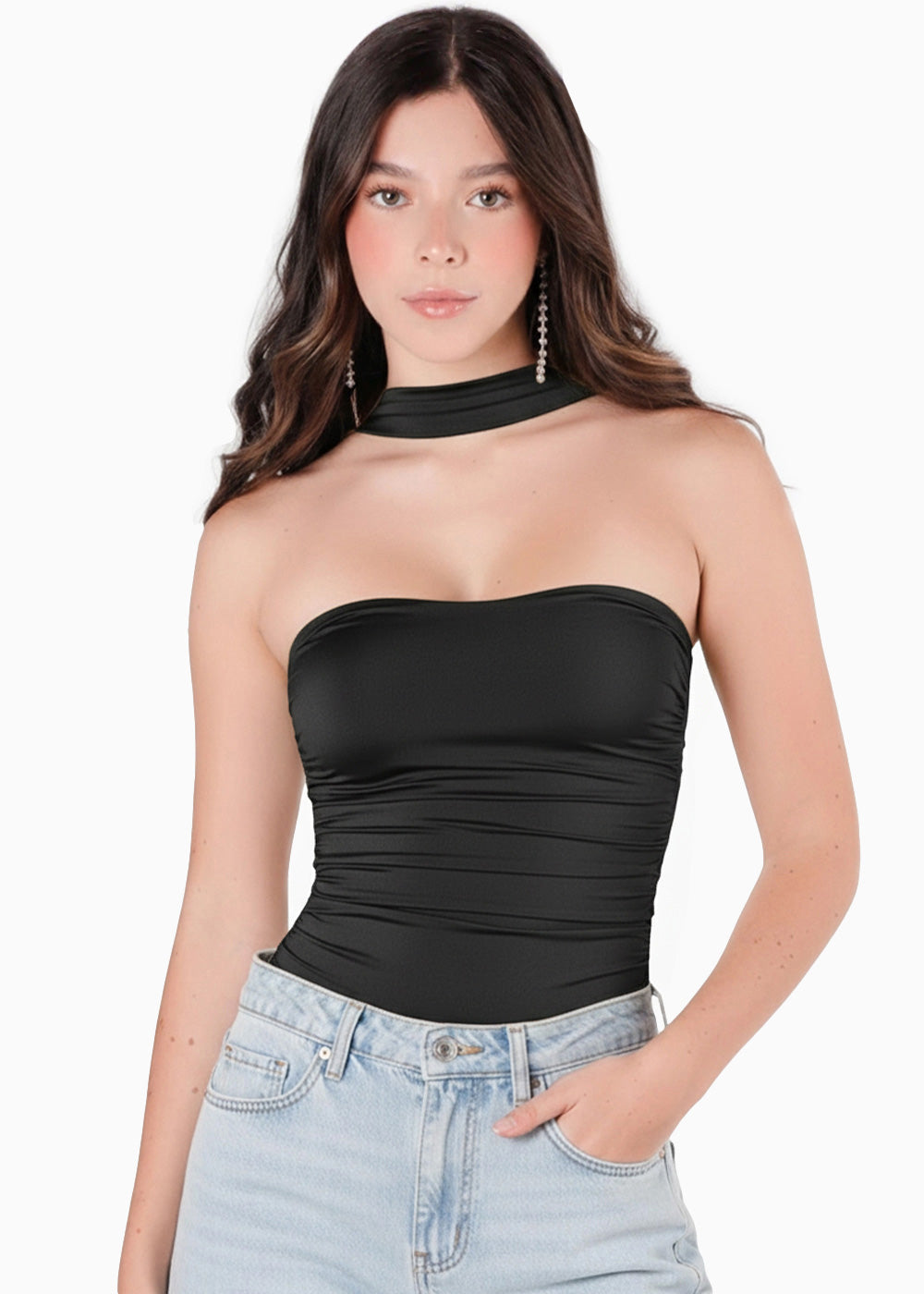 - Body color negro con escote de corazón y choker.