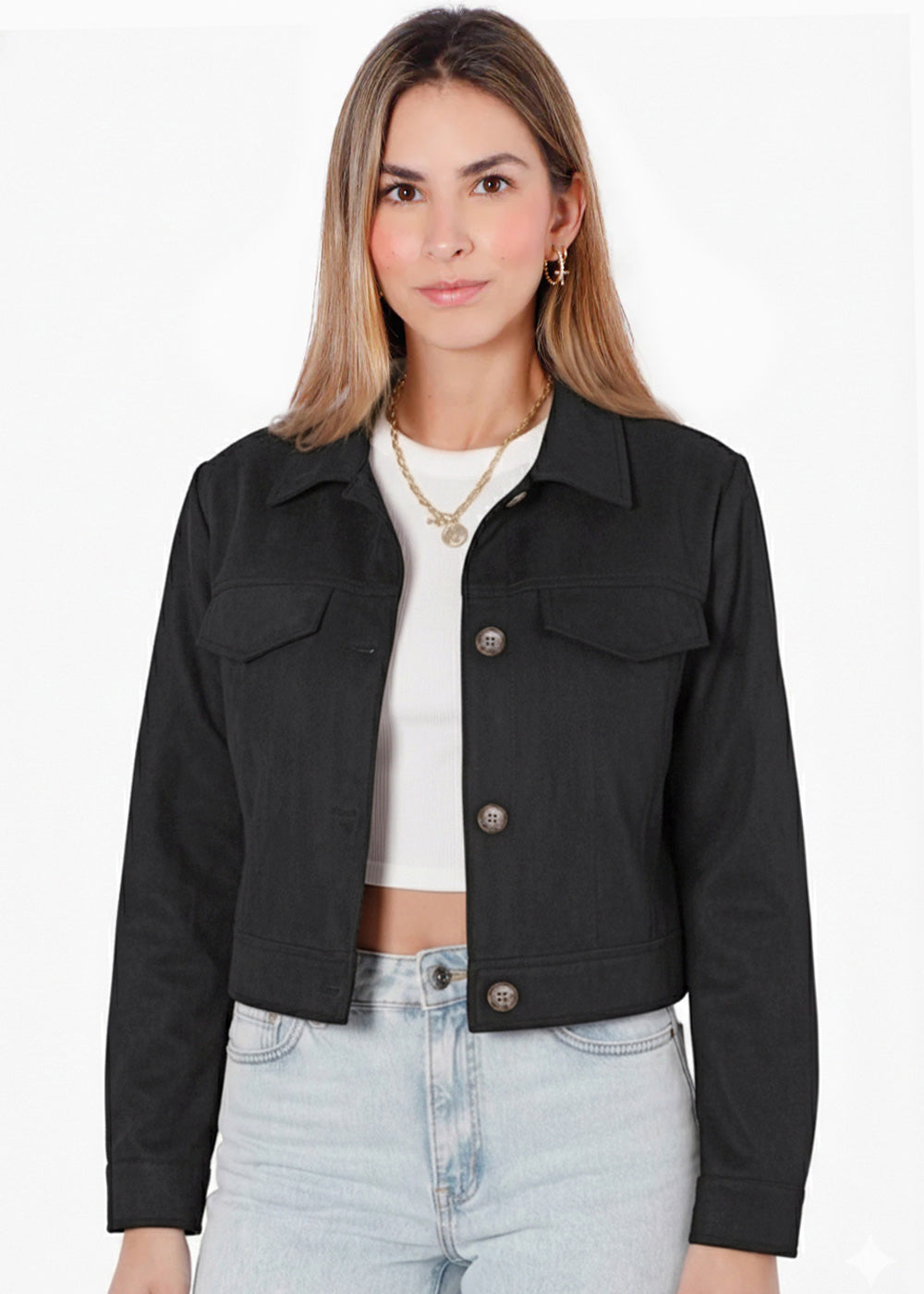 Chaqueta tipo gamuza con entrelazado en cuello y bolsillos - CEIBA.NEGRO