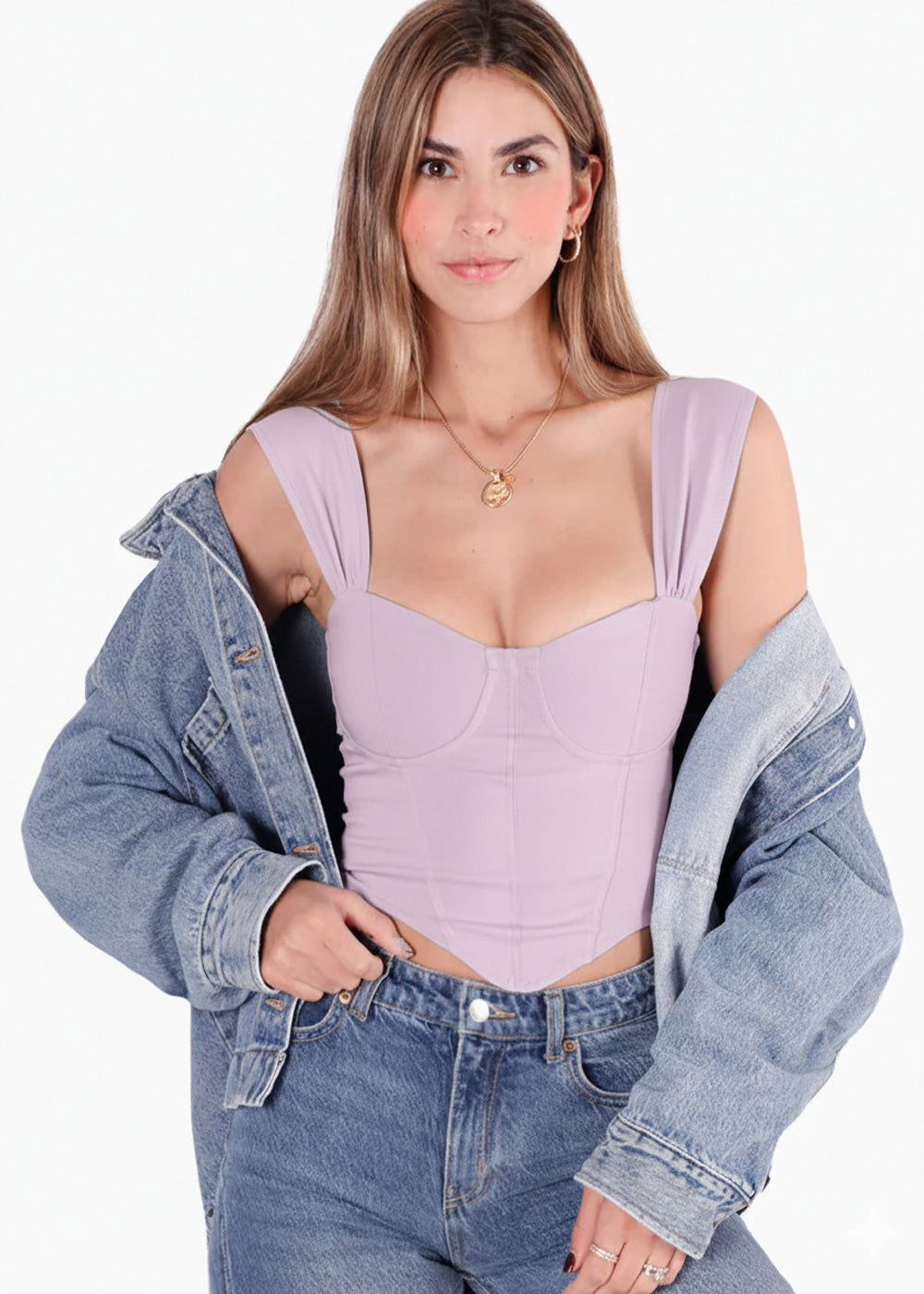 - Blusa tipo corset color lila con mangas efecto drapeado.