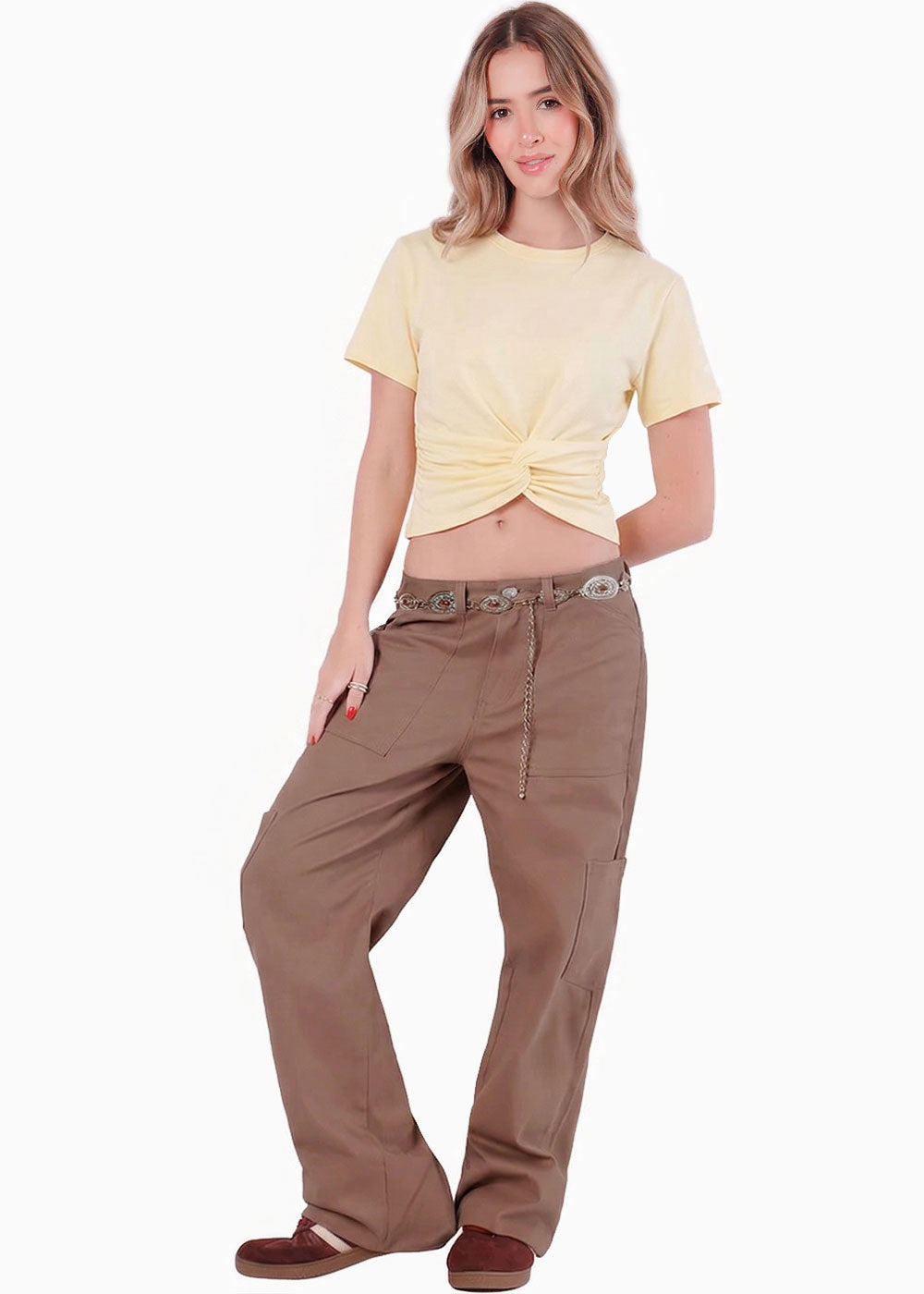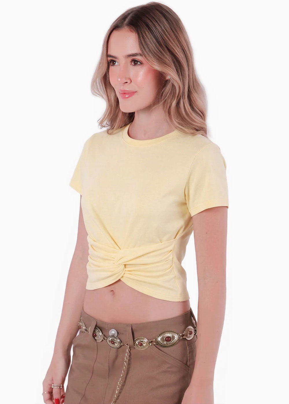 - Material: 100% algodón. - Camiseta con entorchado color amarillo.- Renata, la modelo usa talla XS y mide 160 cm.