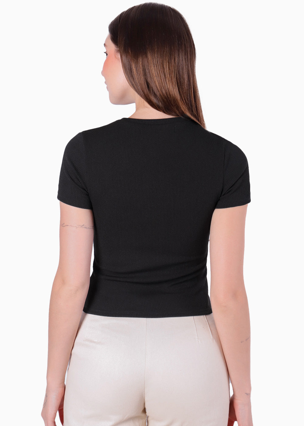 - Camiseta corta y ajustada tipo baby tee con bordado color negro.
